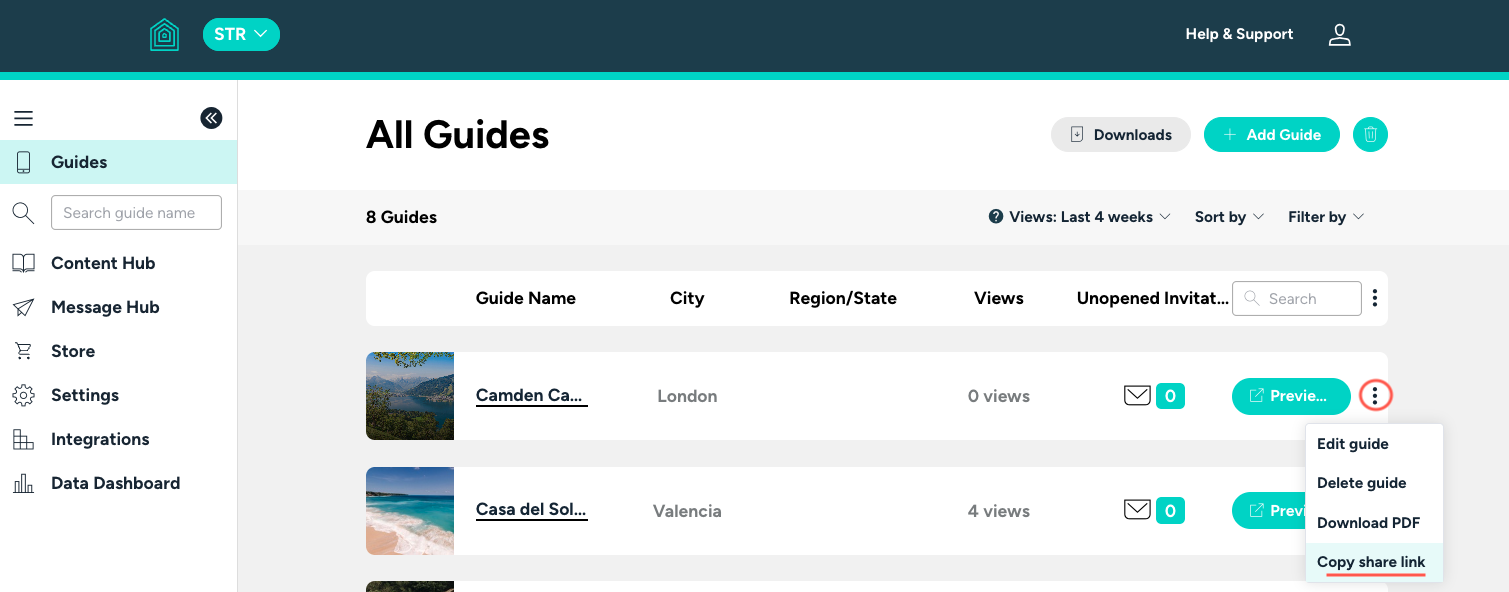 Invitation links are unique links created for specific guide users, and views per user are tracked. Invitation links can be automatically created through one of our PMS integrations, through CSV file upload or manually, one by one. These links can be customised by date (period within which the guide is visible to the user) or to limit visibility of guidebook sections.