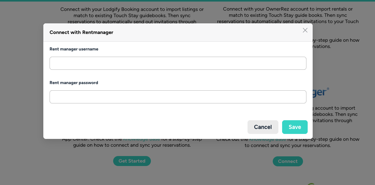 Next, log in to Touch Stay, go to Integrations, and click Connect under the Rent Manager logo. Paste your Rent Manager username and password into the boxes, and then click 'Save'.