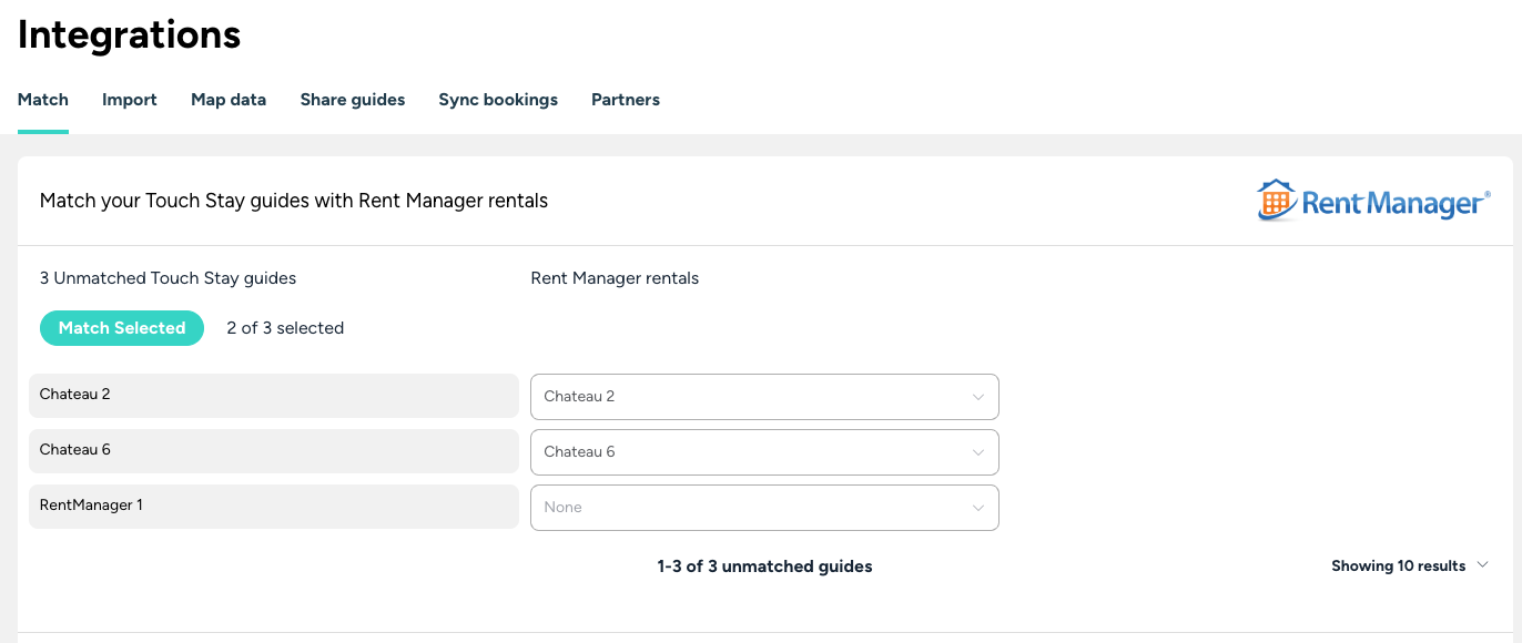 Once authorised, you can match any existing Touch Stay guides to your Rent Manager units. Go to the Match tab on the Integrations page.