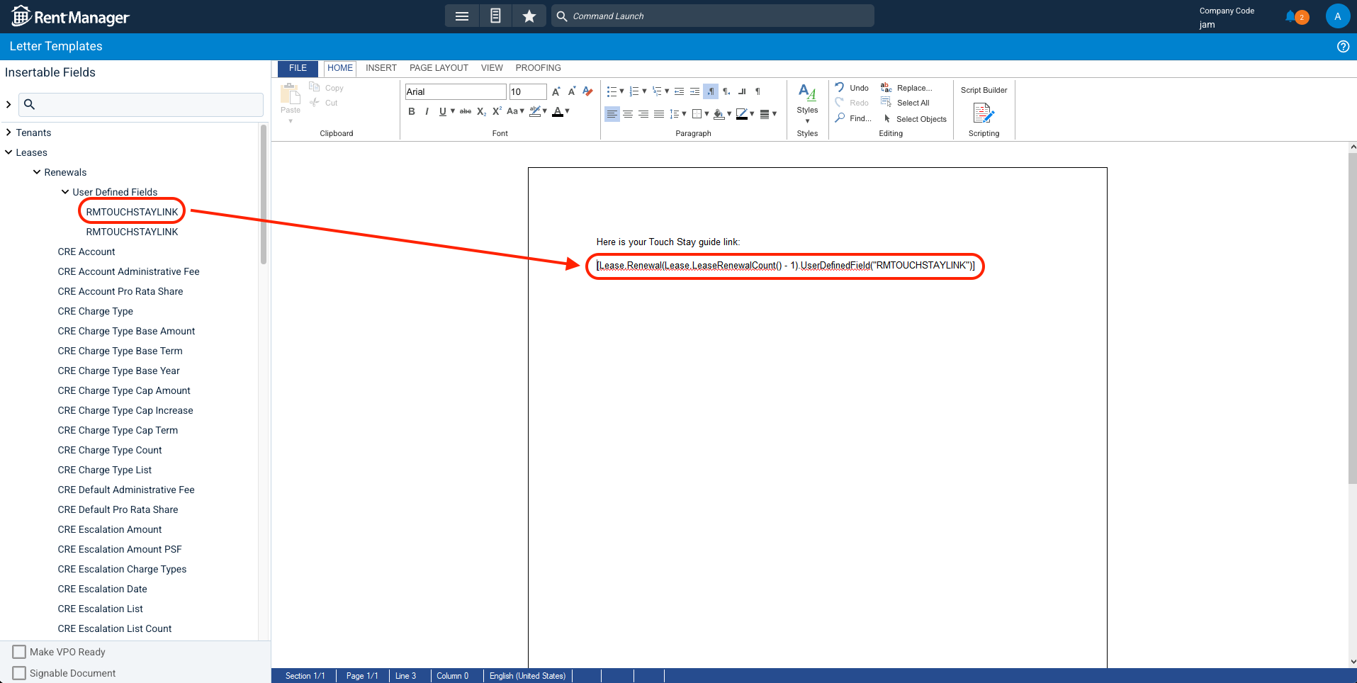 - Under User Defined Fields, drag the first RMTOUCHSTAYLINK towards your template.