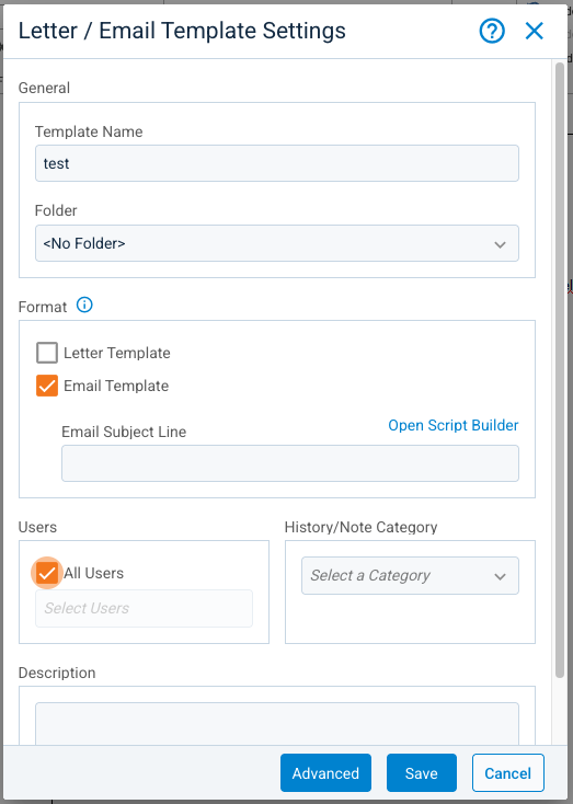 - Click File, and then Save. Add your template name, check 'Email Template' and 'All Users', and then hit Save.