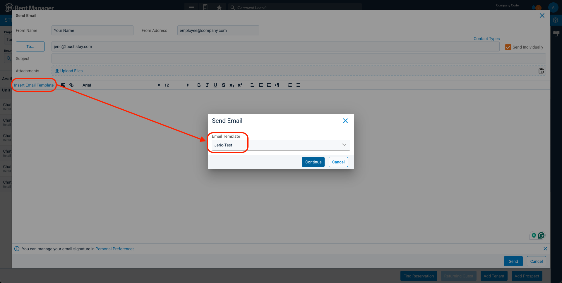 - On the Send Email dialog, click 'Insert Email Template', select the template that you've created, and then click 'Continue'
