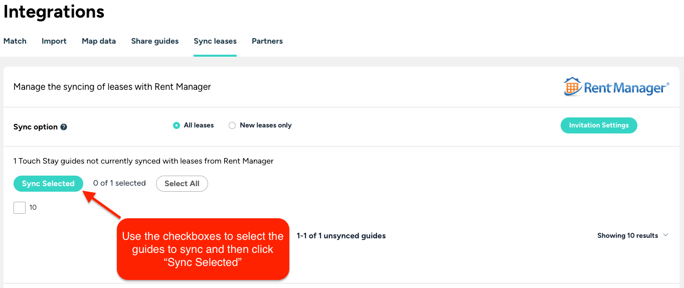 Go to the Sync leases tab on the Integration page. Select the guides you want to sync using the checkboxes.