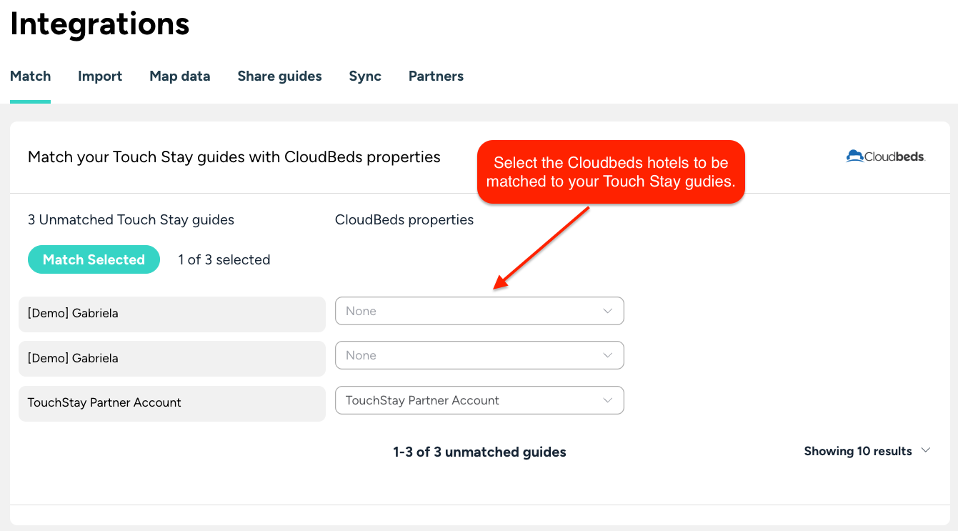 Once authorised, you can match any existing Touch Stay guides to your Cloudbeds properties. Go to the Match tab on the Integrations page.