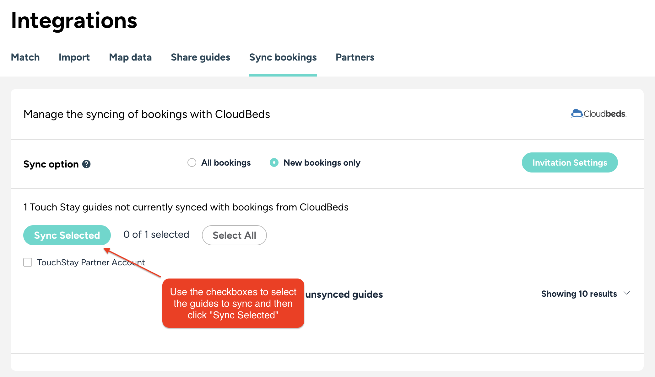 Go to the Sync reservations tab on the Integrations page. Select the guides you want to sync using the checkboxes.