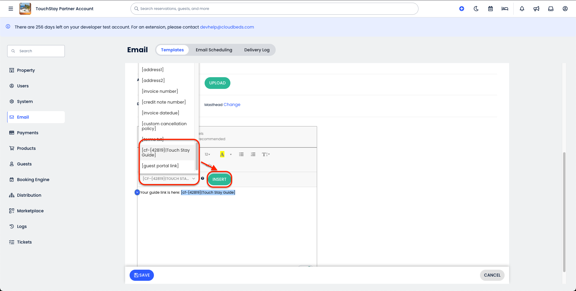 In the Email template screen, place your cursor where you would like the guide link to go, click the drop-down menu on the message editor, select [cf-{42819}|Touch Stay Guide], click 'Insert', and then hit 'Save'.