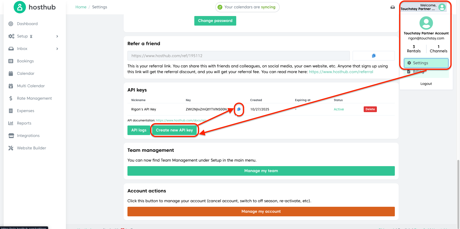 You will need to get your Hosthub API key to get started. Log into your Hosthub account and go to Settings. Follow the steps below to generate your API key: