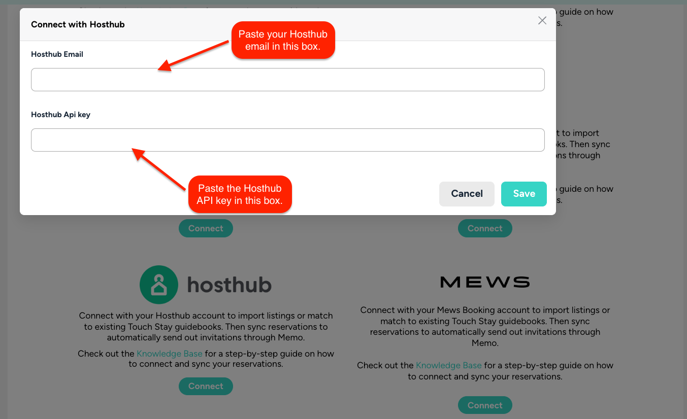 Next, log in to Touch Stay, go to Integrations, and click Connect under the Hosthub logo. Paste your Hosthub Email and API key, and then click 'Save'.