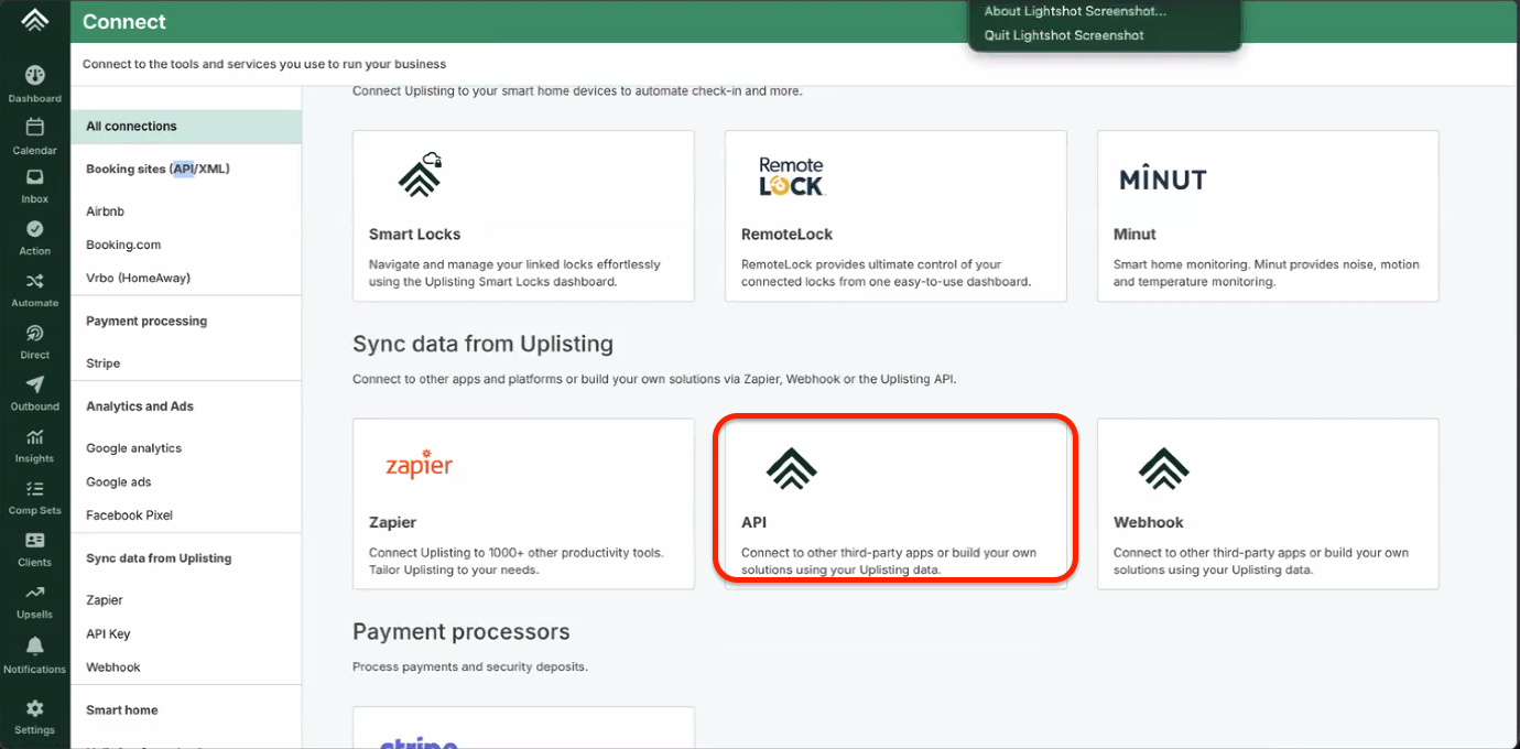 4. On your Touch Stay account, go to Integrations > Uplisting, click Connect, and then paste the API Key from the previous step.