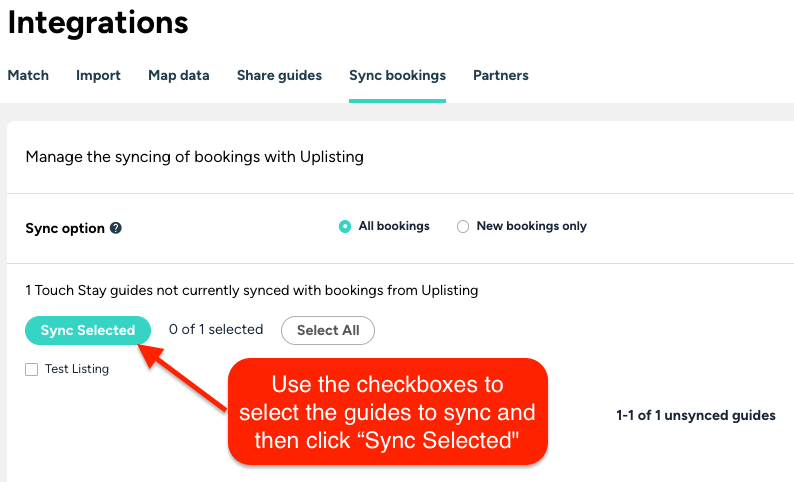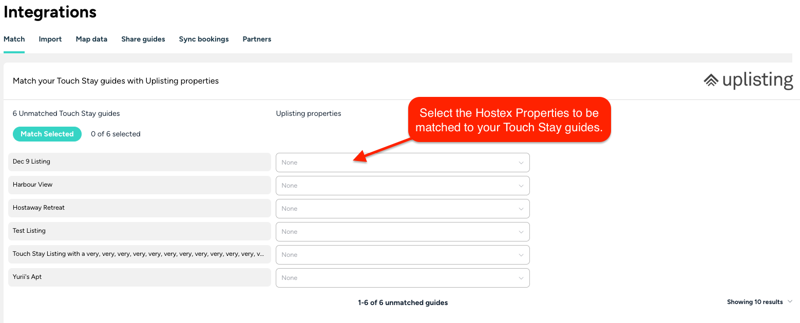 2. Use the drop-down menus to select the correct Uplisting listing for each Touch Stay guide.