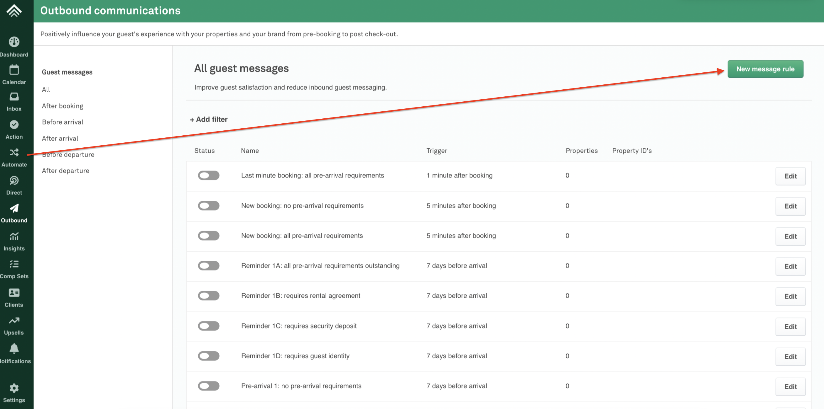 1. Scroll down to the Scheduling section, and set it to the following details: 1 hr after booking . On the Properties section, check all the listings. Finally, hit 'Save Rule'.