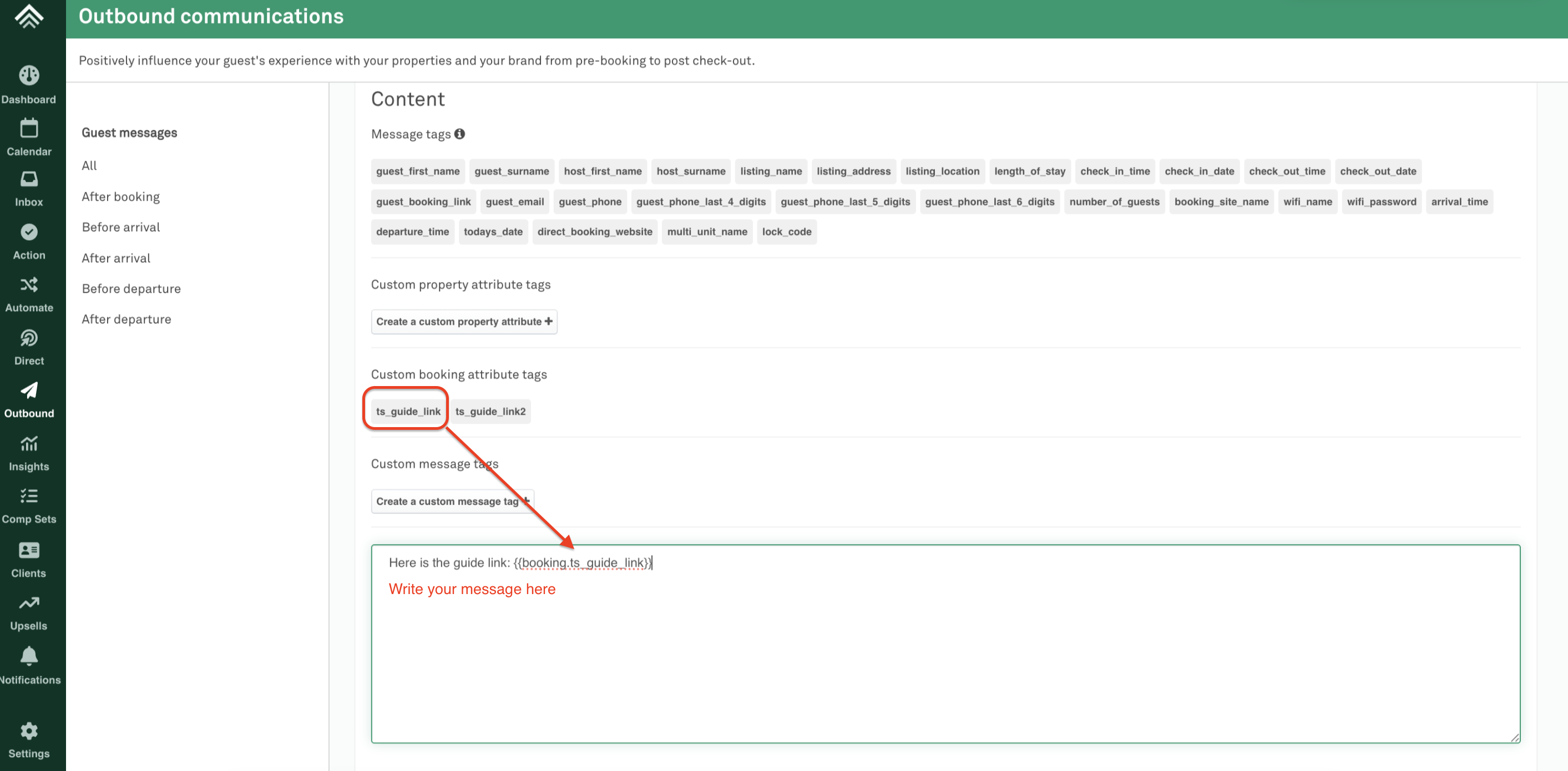 *Please note that the content field will show {{booking.ts_guide_link}}
