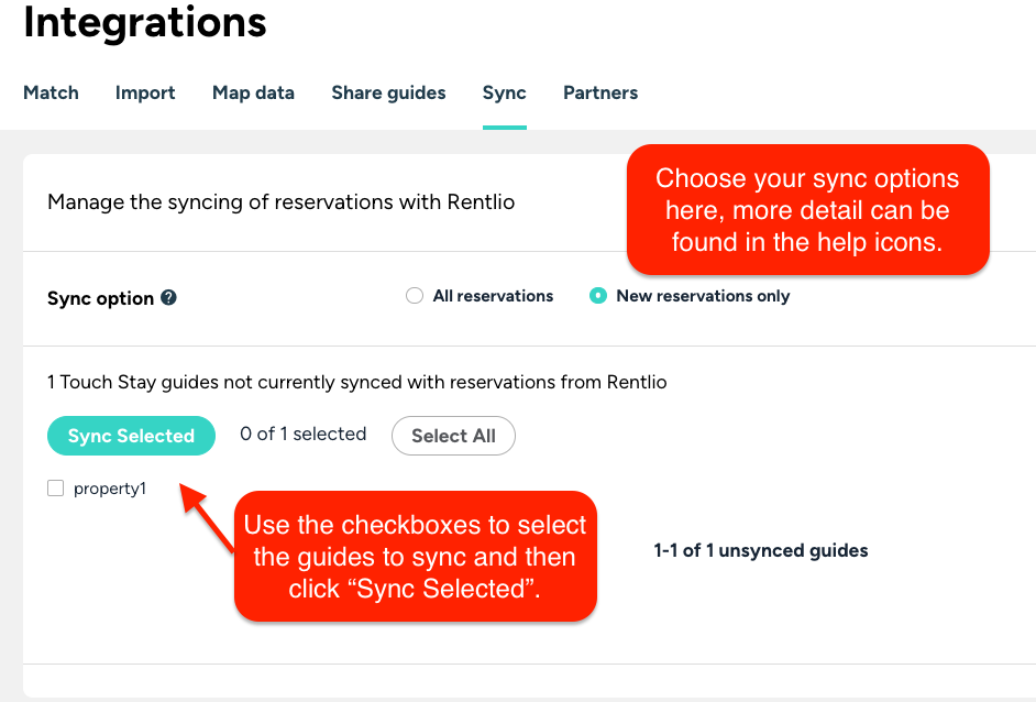 To complete this step, go to Integrations > Sync reservations and select the guides you want to sync using the checkboxes. Use the ‘Select all’ option to select all in one go. Click 'Sync selected'.