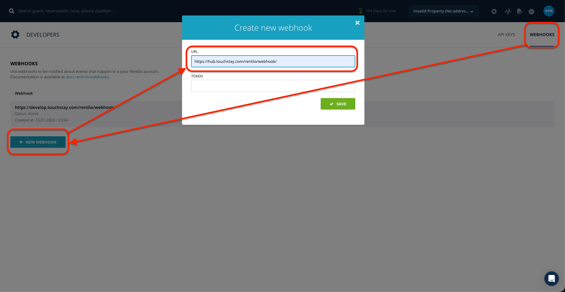 - Return to your Rentlio account, go back to the Developers page, navigate to the Webhooks tab, click 'New Webhook', enter the URL 'https://hub.touchstay.com/rentlio/webhook/', and then hit Save.