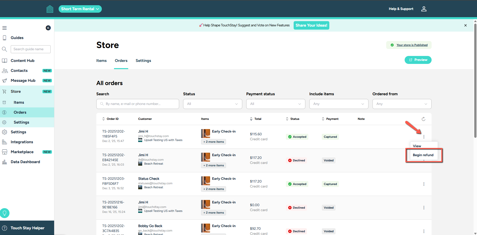 Sometimes, plans change, or a guest may need to cancel an order. While order management starts in Touch Stay, all financial refunds are handled securely through your Stripe Connect dashboard.