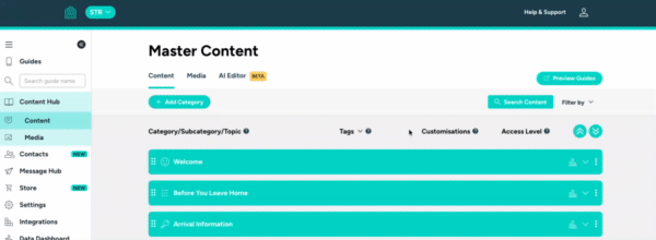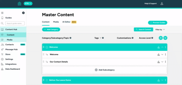 You can create new tags to group guides together, edit existing ones to update names or colours, and decide which guides each tag applies to, all from the Content Hub.